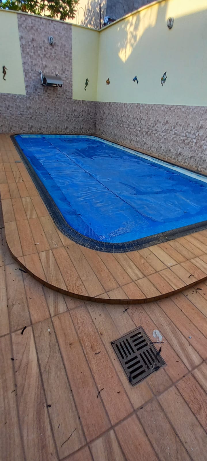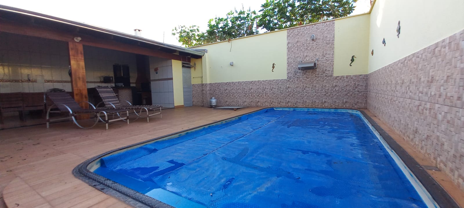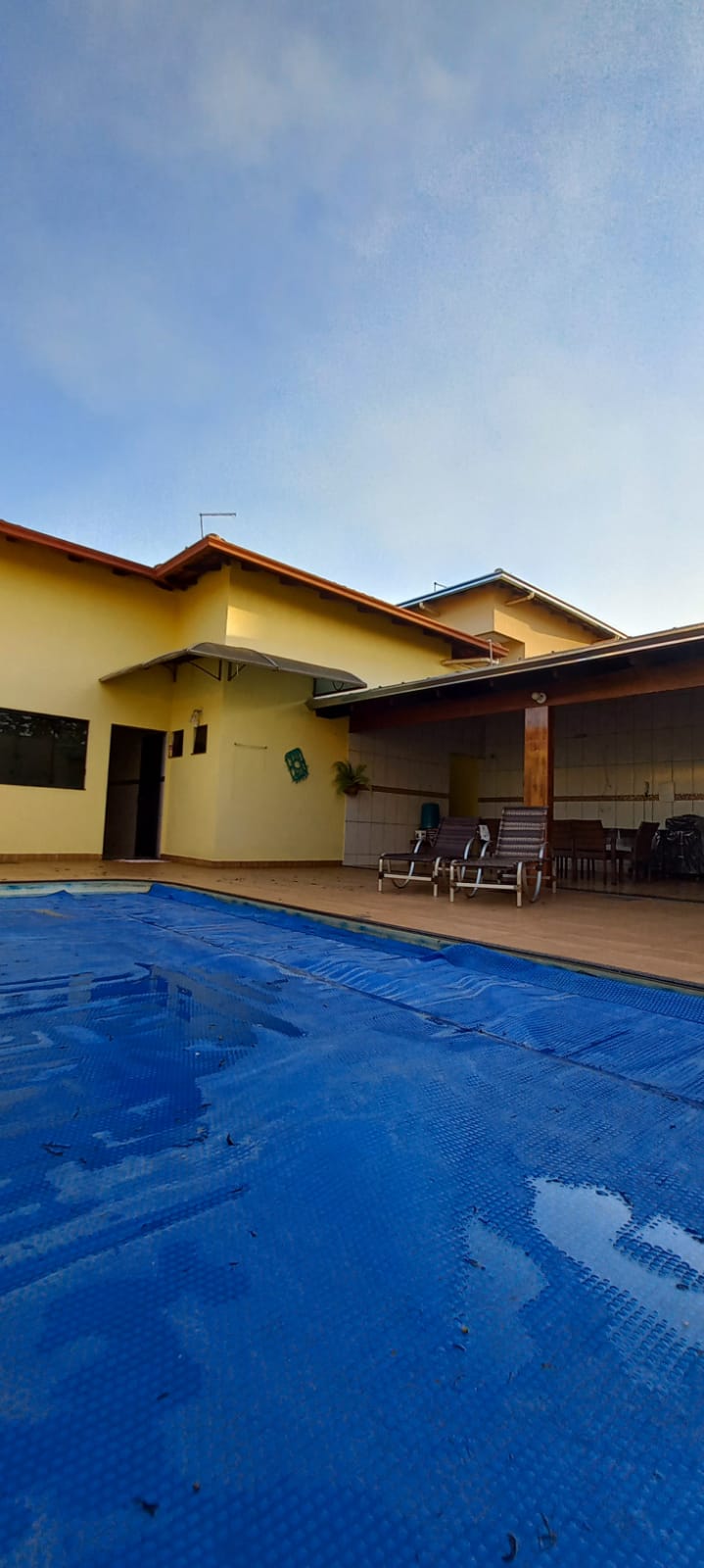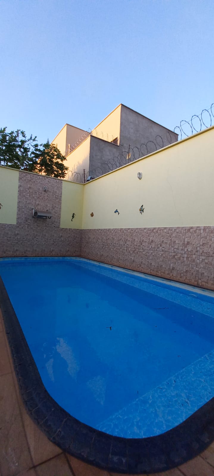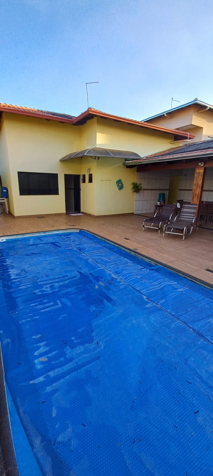 Quintal amplo com churrasqueira, linda piscina com vista panorâmica para a casa, com cascata, iluminação de LED e com aquecimento solar.
