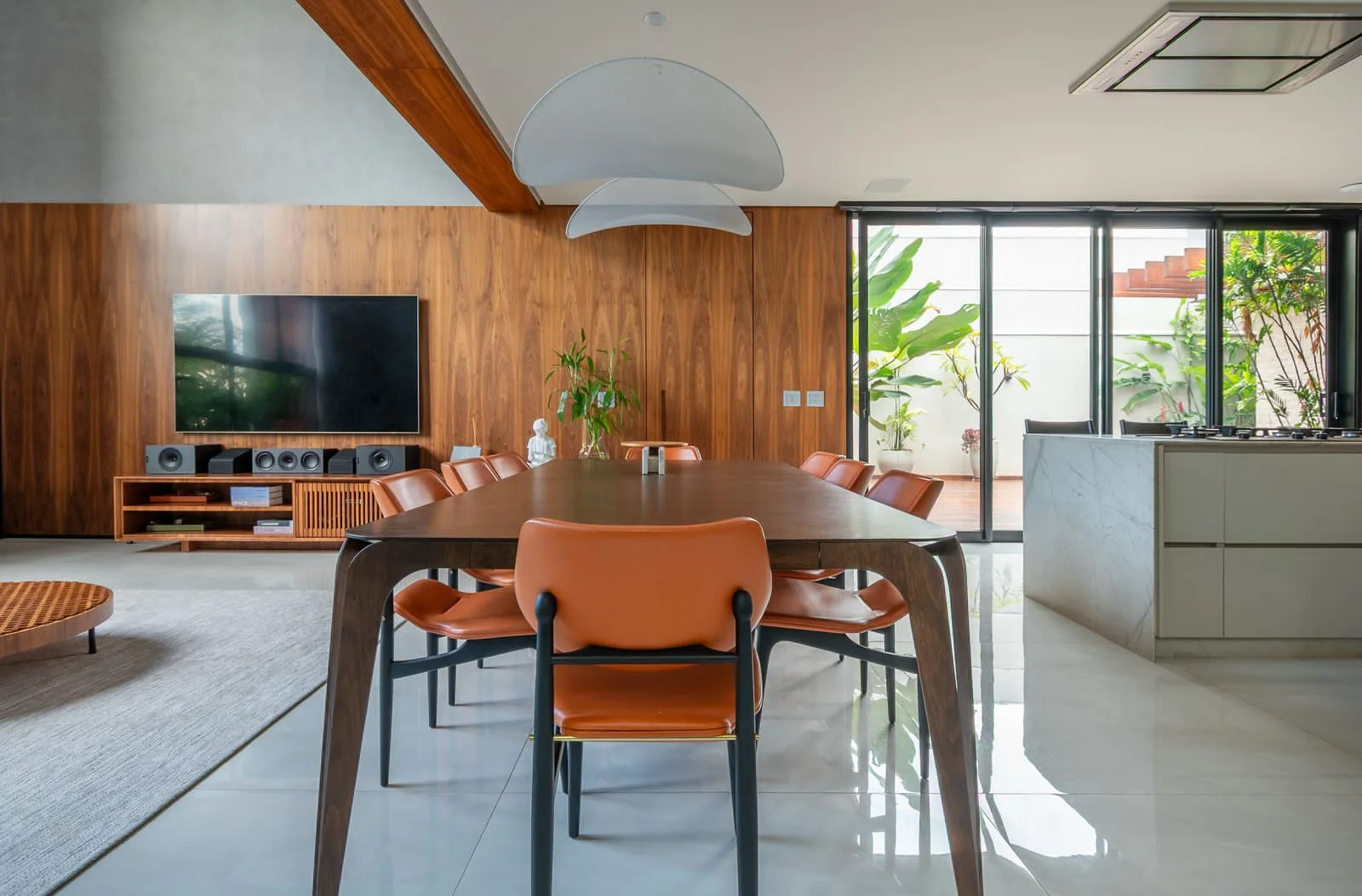 A cozinha com ilha gourmet é um convite à convivência, com vista direta para a piscina.
