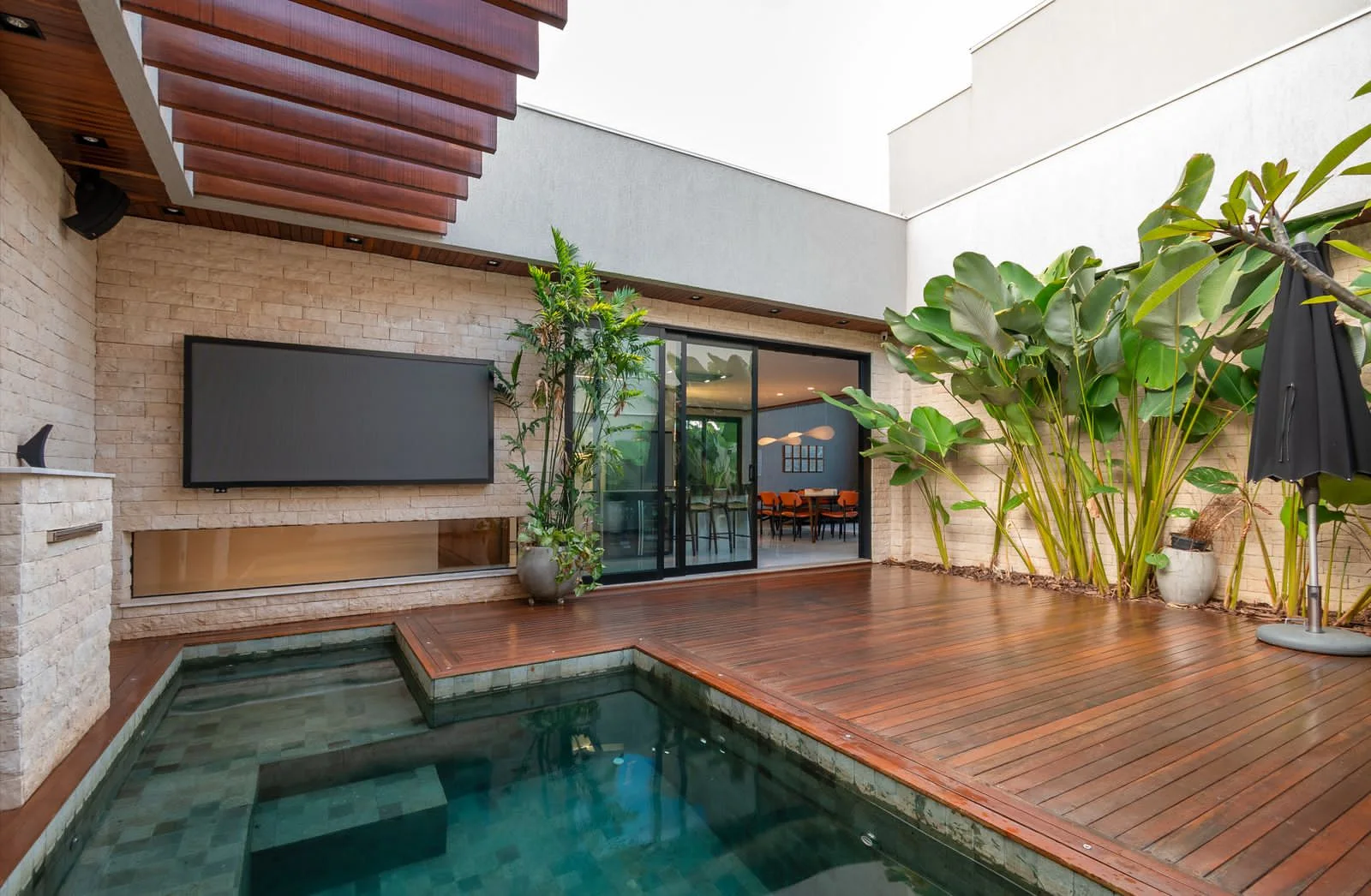 Na área de lazer, piscina aquecida, deck seco, paisagismo contemporâneo e sistema de som e TV em LED inteligente. ,