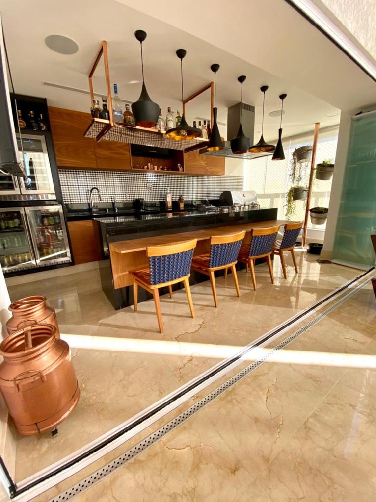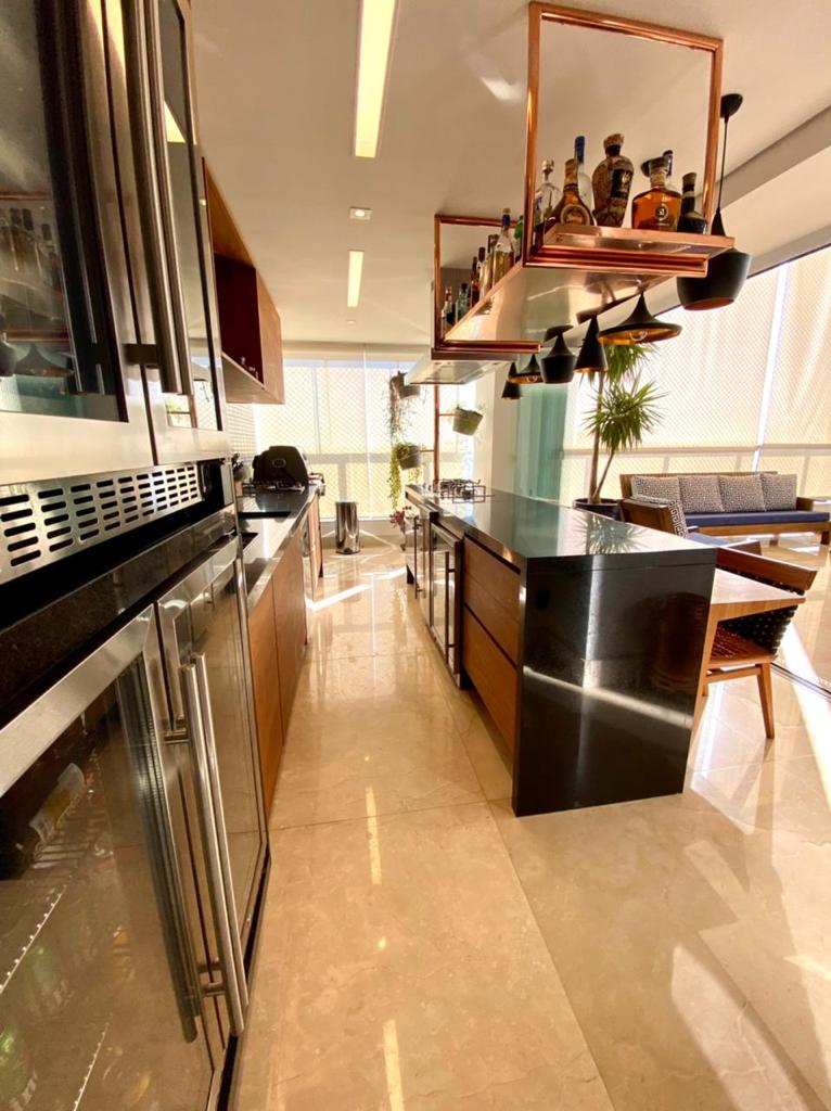 Espaço Gourmet com cozinha e ilha de apoio equipada com refrigeradores, adega, cervejeira, forno elétrico e freezer.