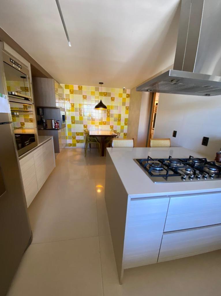 Cozinha equipada com fogão de ilha, coifa e torre quente e com área de serviço isolada.
