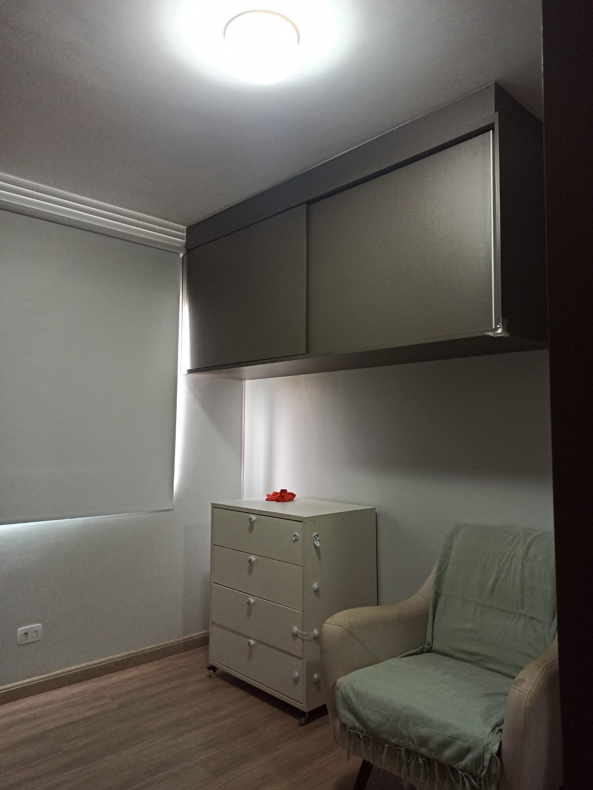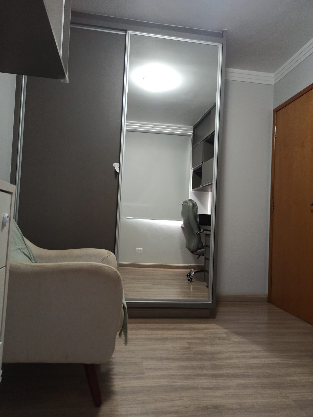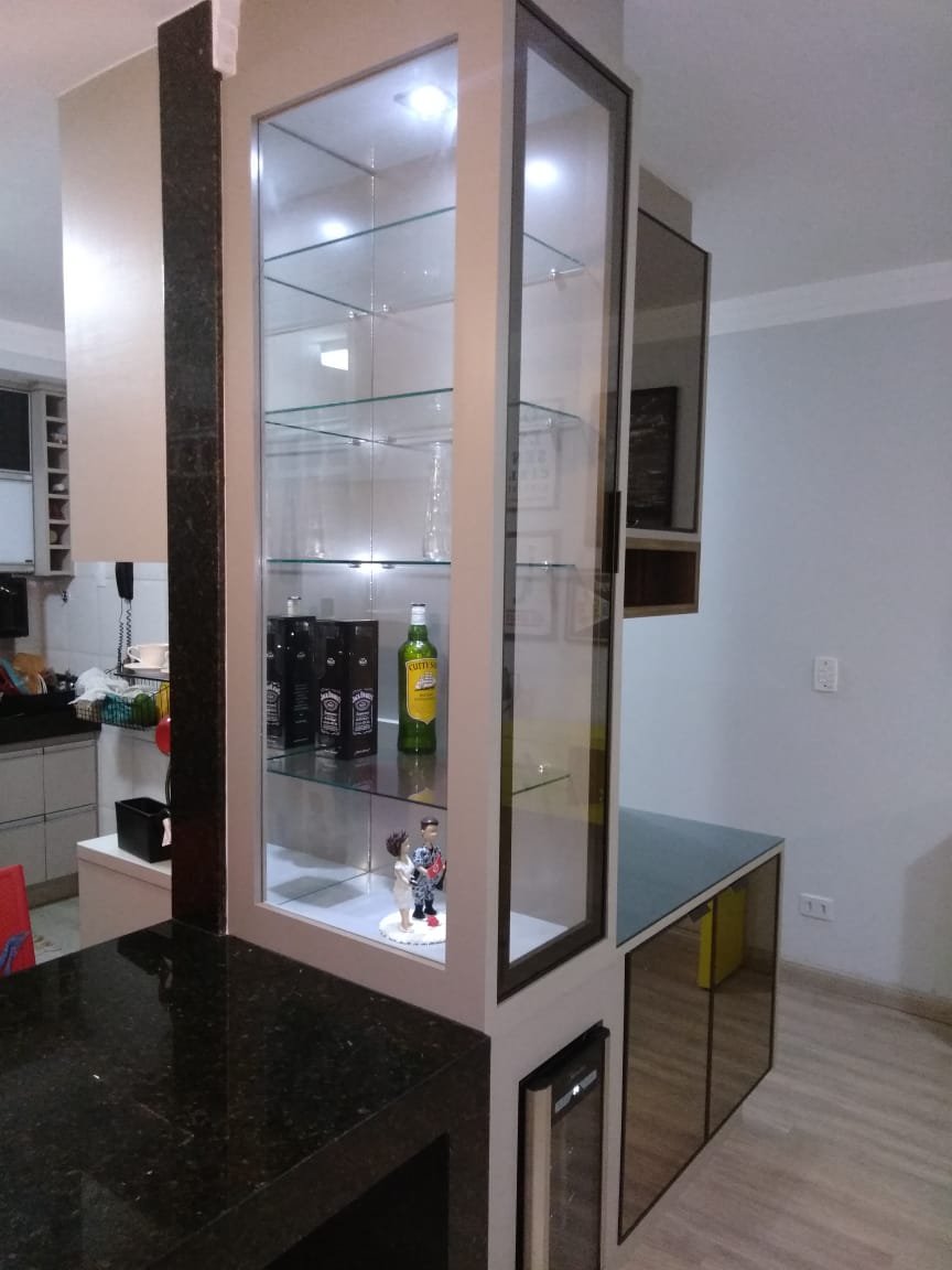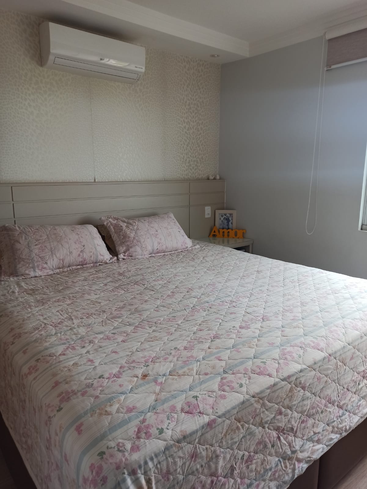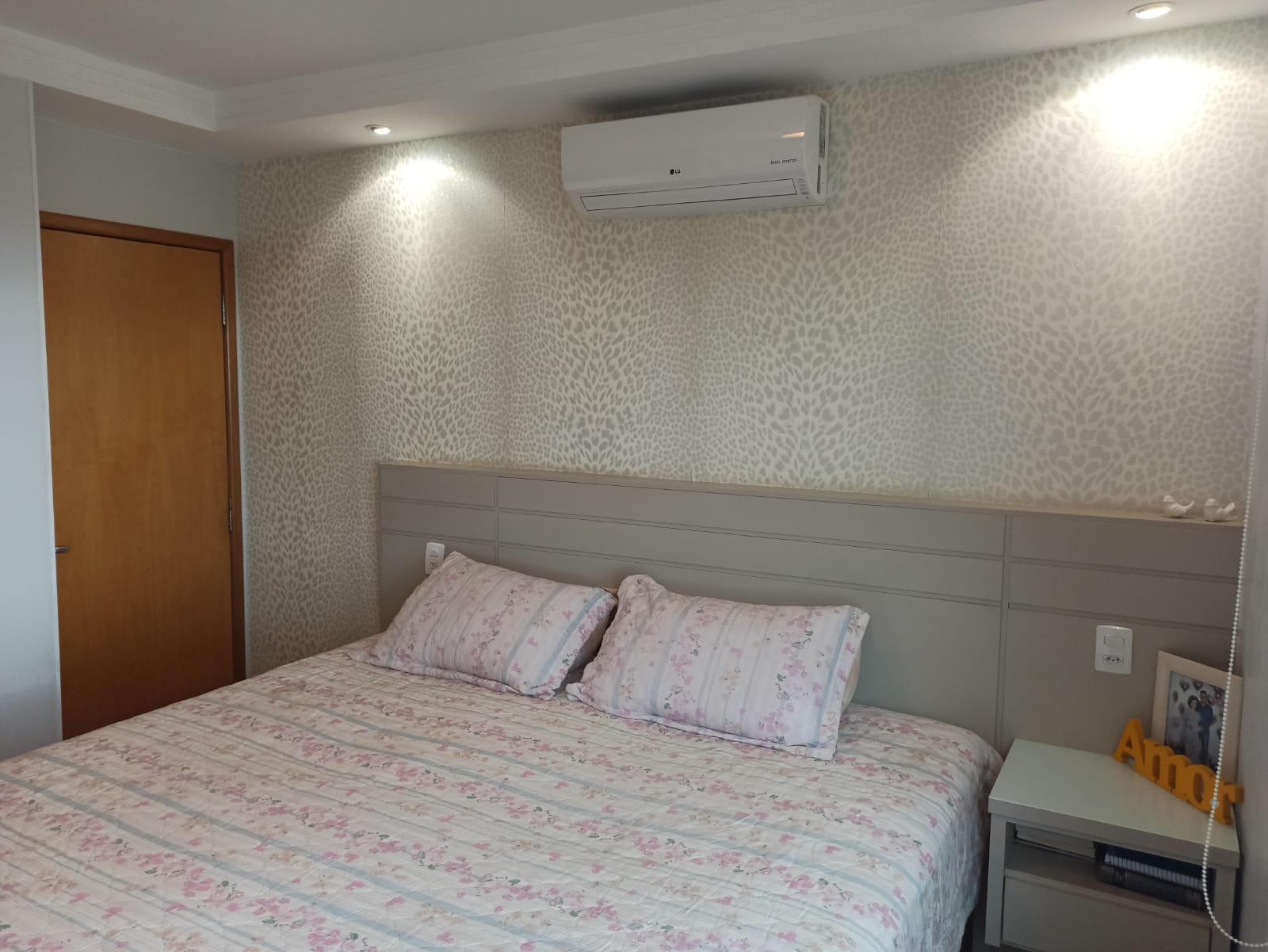 Decorado com papel de parede, projeto luminotécnico, piso vinílico na área social do apartamento (maior conforto térmico).