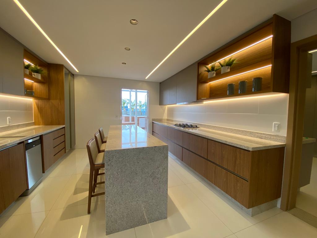 Cozinha ampla integrada ao terraço vip.