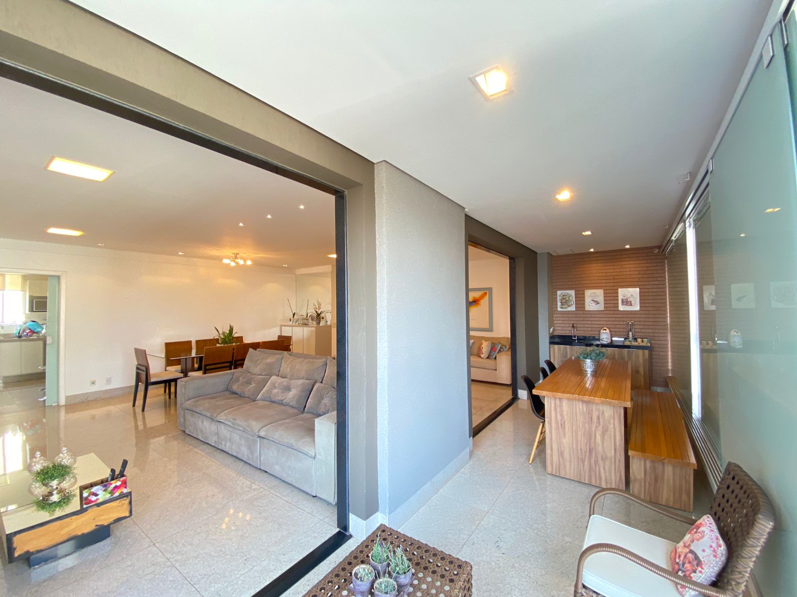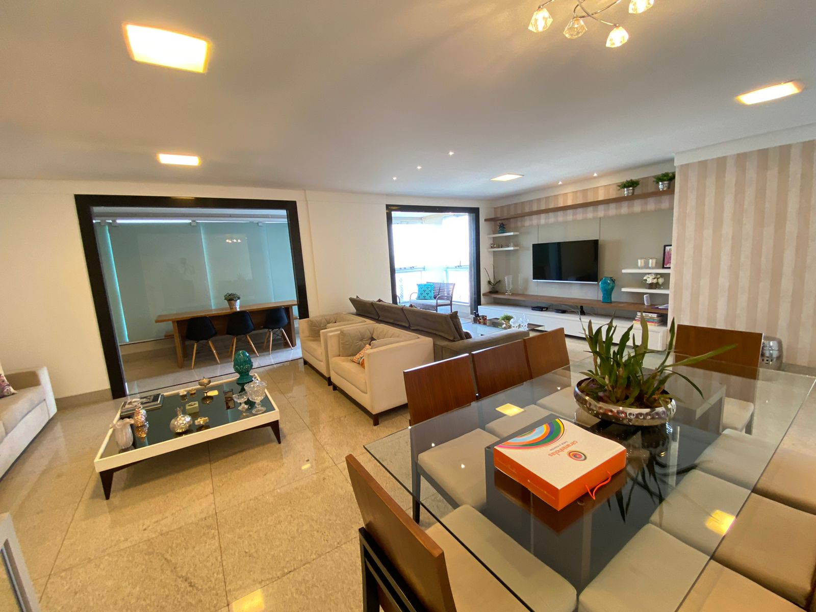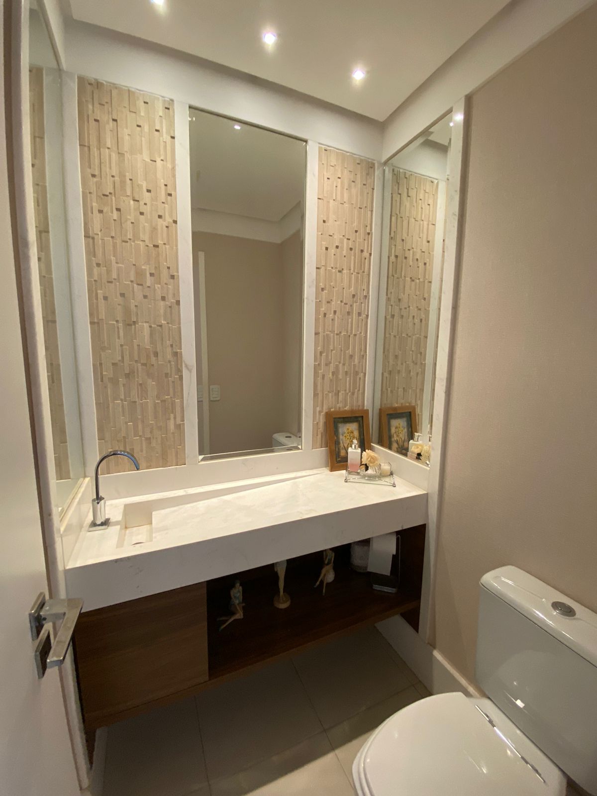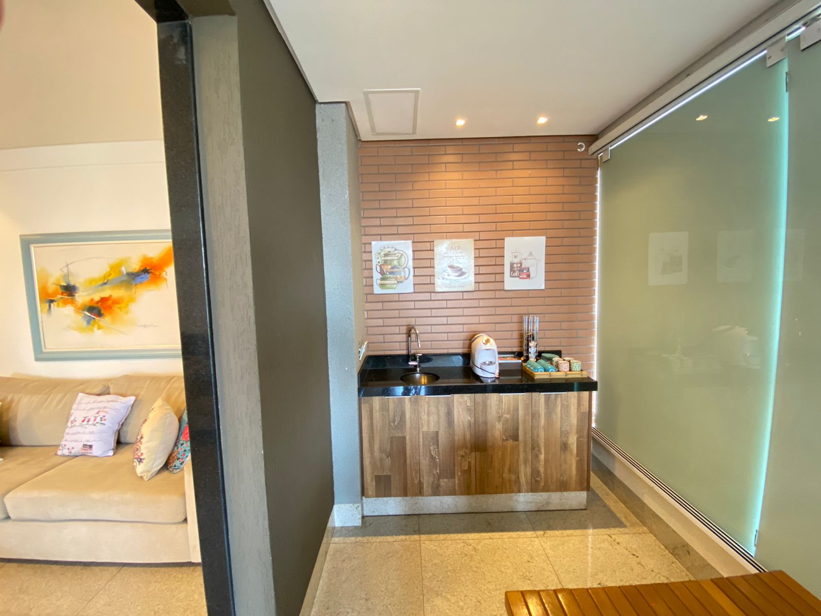 Sala ampla para 3 ambientes, lavabo, varanda com bancada em granito e pia de apoio, com cortina de vidro + porta de correr e piso em porcelanato 80×80 sala e varanda.