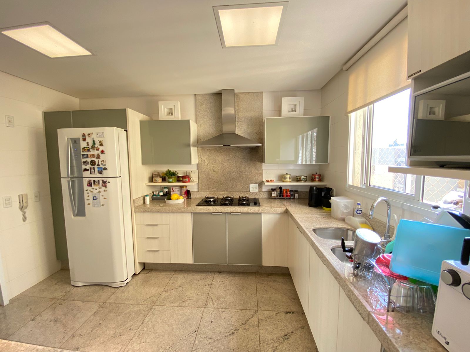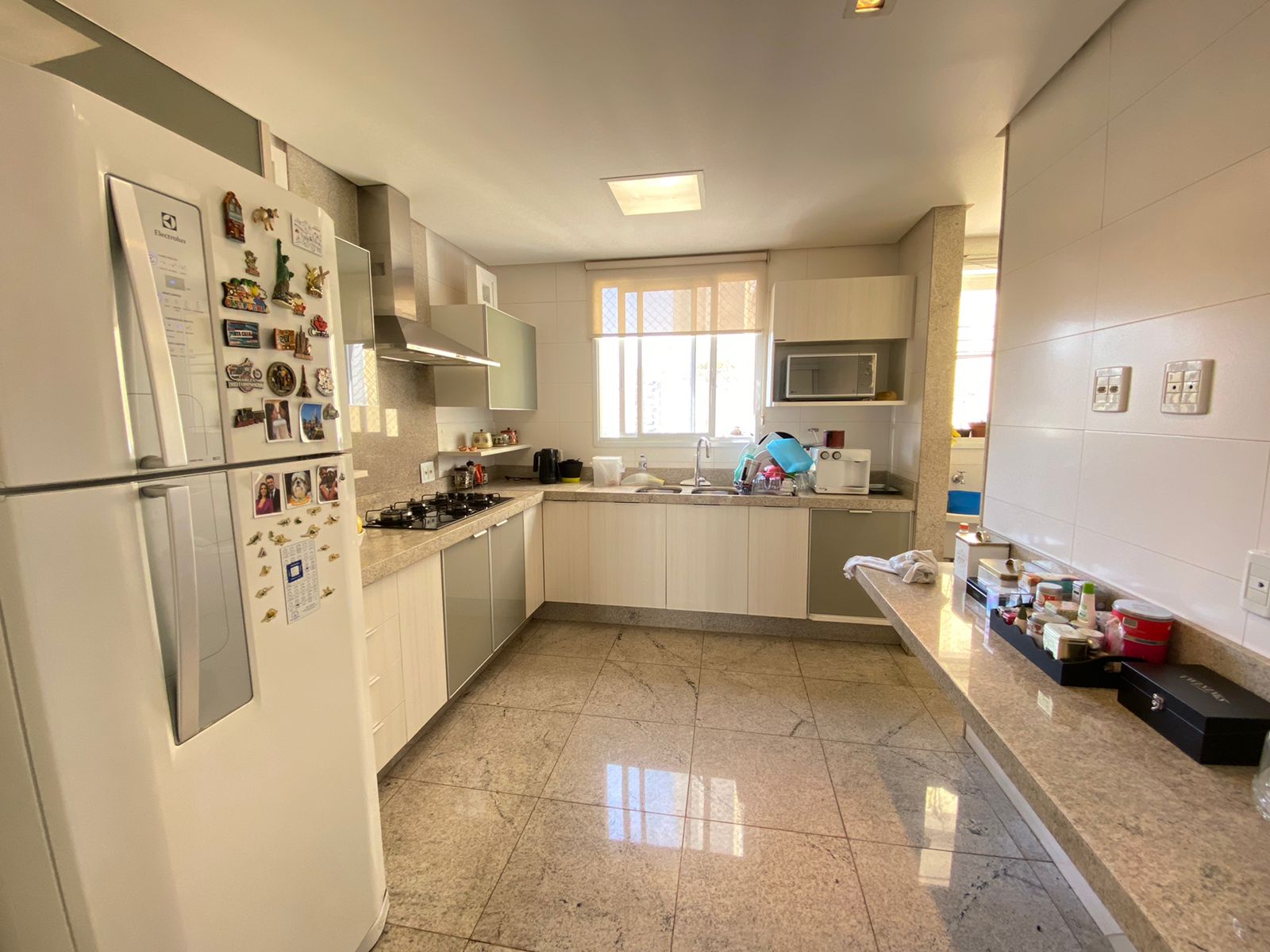 Cozinha montada em armários, área de serviço com armários e bancada de apoio em granito, banheiro e quarto de empregada.